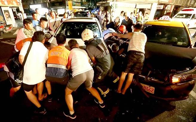 四周的路人也一同前來以人力將自小客車搬開,救護人員隨即將騎士送往北醫救治。(圖片來源:臺灣《中時電子報》)