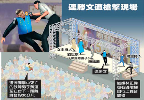 連勝文遭槍擊時(shí),連戰(zhàn)正在板橋市為國(guó)民黨新北市長(zhǎng)候選人朱立倫助選,連戰(zhàn)離開(kāi)會(huì)場(chǎng)后,才在車上獲知消息,他立刻與妻子連方瑀趕往臺(tái)大醫(yī)院探視愛(ài)子。探視完后,他強(qiáng)忍悲痛,回到現(xiàn)場(chǎng)為國(guó)民黨臺(tái)北市長(zhǎng)候選人郝龍斌站臺(tái),現(xiàn)場(chǎng)逾6萬(wàn)名藍(lán)軍支持者呼喊:“連戰(zhàn)加油!”此刻連戰(zhàn)再也忍不住淚水,哽咽要大家支持郝龍斌 。