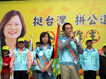 2012臺灣地區(qū)領(lǐng)導(dǎo)人選舉參選人蔡英文昨天在高雄市輔選時,呼吁民眾集中選票支持民進黨籍民代參選人郭玟成,在同一個選區(qū)參選的陳致中說,將繼續(xù)拚選舉。