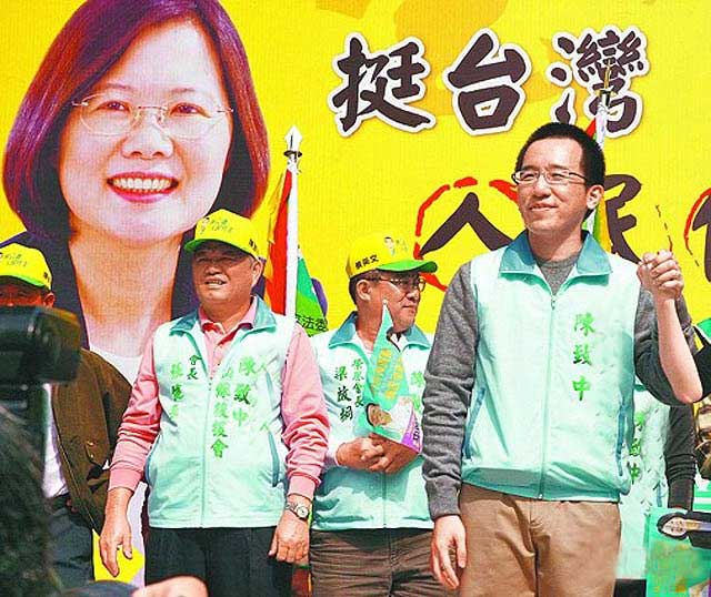 陳致中參選民代競選總部昨成立,高掛蔡英文照片,蔡英文競選總部發(fā)言人徐佳青形容,陳致中像是加盟店,而非直營店,她有信心選民能分辨差別。