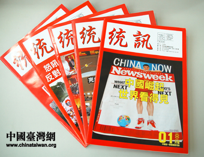 王津平向中國臺灣網記者贈送的中國統一聯盟機關刊物《統訊》