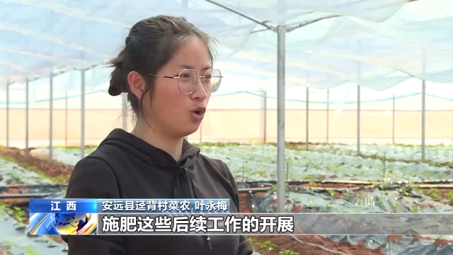 安遠縣逕背村菜農 葉永梅:我們的蔬菜種下去半個多月了,長勢是非常喜人,然后我們要抓緊覆膜、施肥這些后續工作的開展,以便于給蔬菜提供一個良好的生長環境,確保豐收高產。