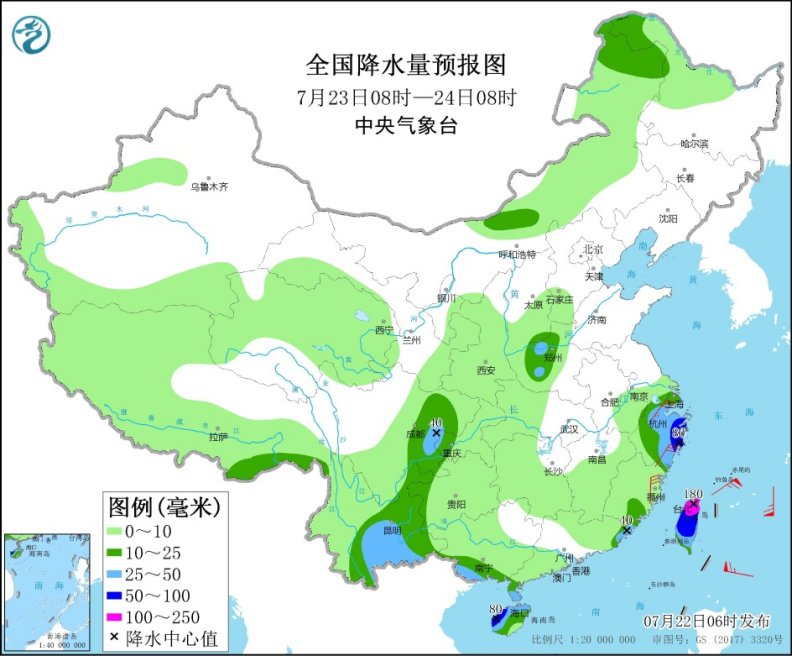 7月23日08時至24日08時,內(nèi)蒙古東北部、西藏東南部、河南中西部、江南東部、西南地區(qū)東部和南部、廣西南部、海南島、臺灣島等地部分地區(qū)有中到大雨,其中,浙江東部、海南島西北部、臺灣島等地部分地區(qū)有暴雨或大暴雨(100~180毫米)。浙江、福建東部等地部分地區(qū)有5~6級風(fēng)。