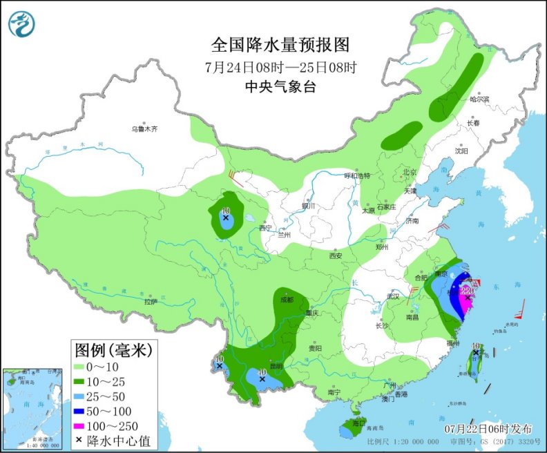 7月24日08時至25日08時,內(nèi)蒙古東南部、黑龍江西南部、青海北部、江南東部、西南地區(qū)東部和南部、海南島、臺灣島等地部分地區(qū)有中到大雨,其中,上海大部、浙江中東部等地部分地區(qū)有暴雨或大暴雨(100~220毫米)。甘肅河西、湖北東部等地部分地區(qū)有4~6級風(fēng)。