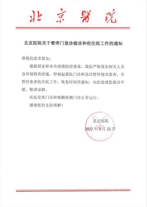中新網3月21日電 據北京醫院微信公眾號21日消息,根據國家和北京市疫情防控要求,該醫院嚴格落實相關人員及環境篩查措施,即刻起該醫院門診和急診暫停接診患者,并暫;颊呤兆≡汗ぷ,恢復時間另行通知。發熱門診和核酸檢測門診正常運行。通知如下: