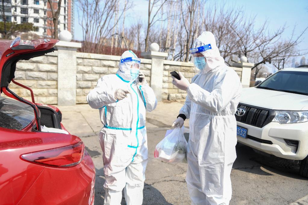 3月21日,在吉林市一小區(qū)卡口,志愿者張銳(右)、陳斌打電話通知社區(qū)工作人員取貨。新華社記者 張楠 攝