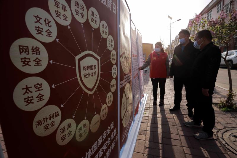 4月14日,居民在河北省遵化市西三里鎮(zhèn)一社區(qū)觀看國家安全相關(guān)知識(shí)展覽。