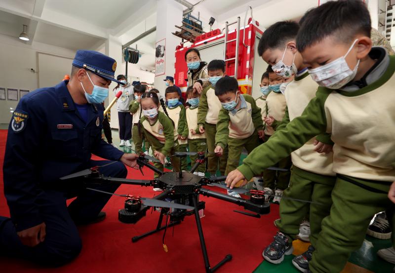 4月14日,在安徽全椒縣消防救援大隊(duì),消防員向小朋友們展示消防救援無人機(jī)。