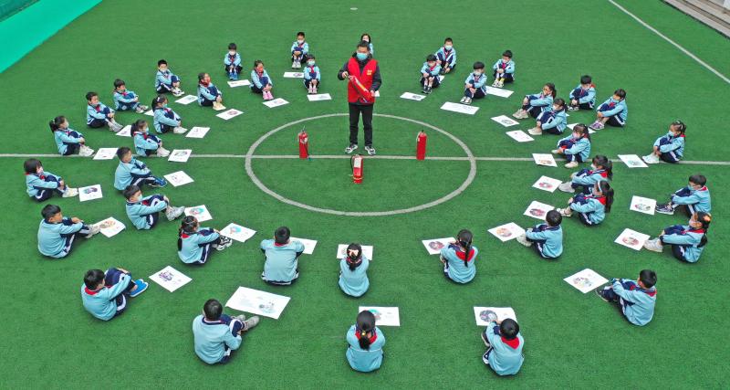 4月14日,浙江省臺(tái)州市仙居縣第一小學(xué)的學(xué)生學(xué)習(xí)消防安全相關(guān)知識(shí)(無人機(jī)照片)。