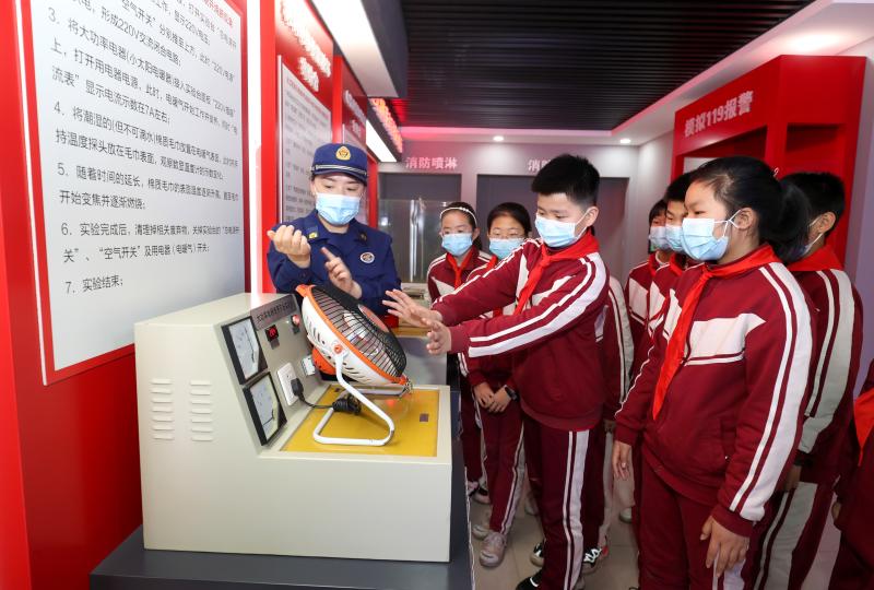 4月14日,在河北省石家莊市井陘礦區(qū)消防救援大隊(duì)科普教育館,消防隊(duì)員(左一)為學(xué)生們講大功率電器安全使用常識(shí)。