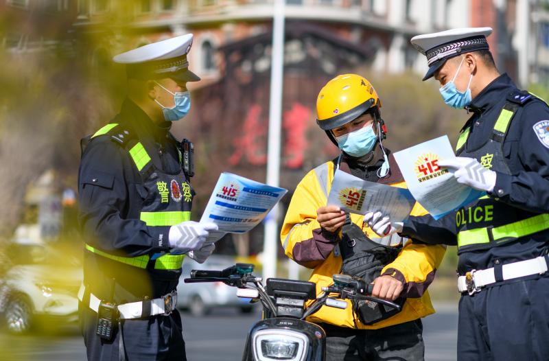 4月14日,在新疆烏魯木齊市勞動(dòng)街路口處,烏魯木齊市公安局交通警察支隊(duì)特勤大隊(duì)民警向外賣騎手發(fā)放宣傳手冊。