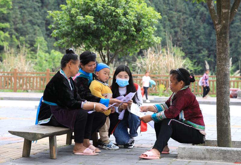 4月14日,志愿者在貴州省黔東南苗族侗族自治州從江縣剛邊鄉(xiāng)三百河社區(qū)向人們講解國家安全相關(guān)知識(shí)。