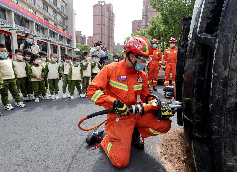4月14日,在安徽省全椒縣消防救援大隊(duì),消防員向小朋友們演示交通事故救援。