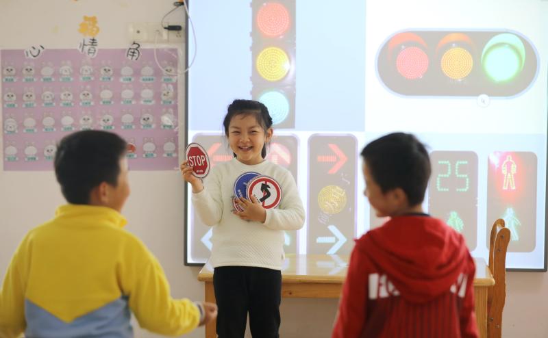 4月14日,在安徽省合肥市蜀山區(qū)琥珀街道北苑村社區(qū)轄區(qū)幼兒園,小朋友通過互動(dòng)游戲的方式,學(xué)習(xí)了解交通安全知識(shí)。