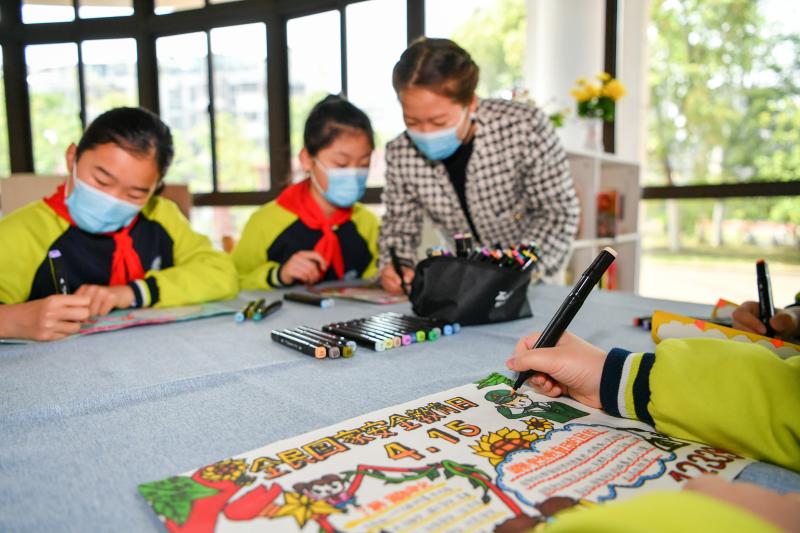4月14日,浙江省湖州市長興縣水口鄉(xiāng)中心幼兒園的孩子們創(chuàng)作國家安全教育主題繪畫。