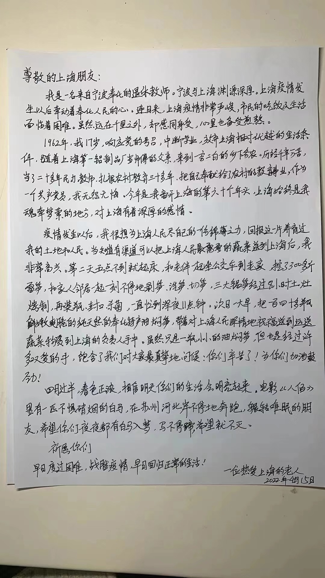 在信的最后,老人為上海人民送上了祝福。他提到,“四月過半,春色正濃,相信明天你們的生活會明亮起來。祈愿你們早日度過困難,戰(zhàn)勝疫情,早日回歸正常的生活!”