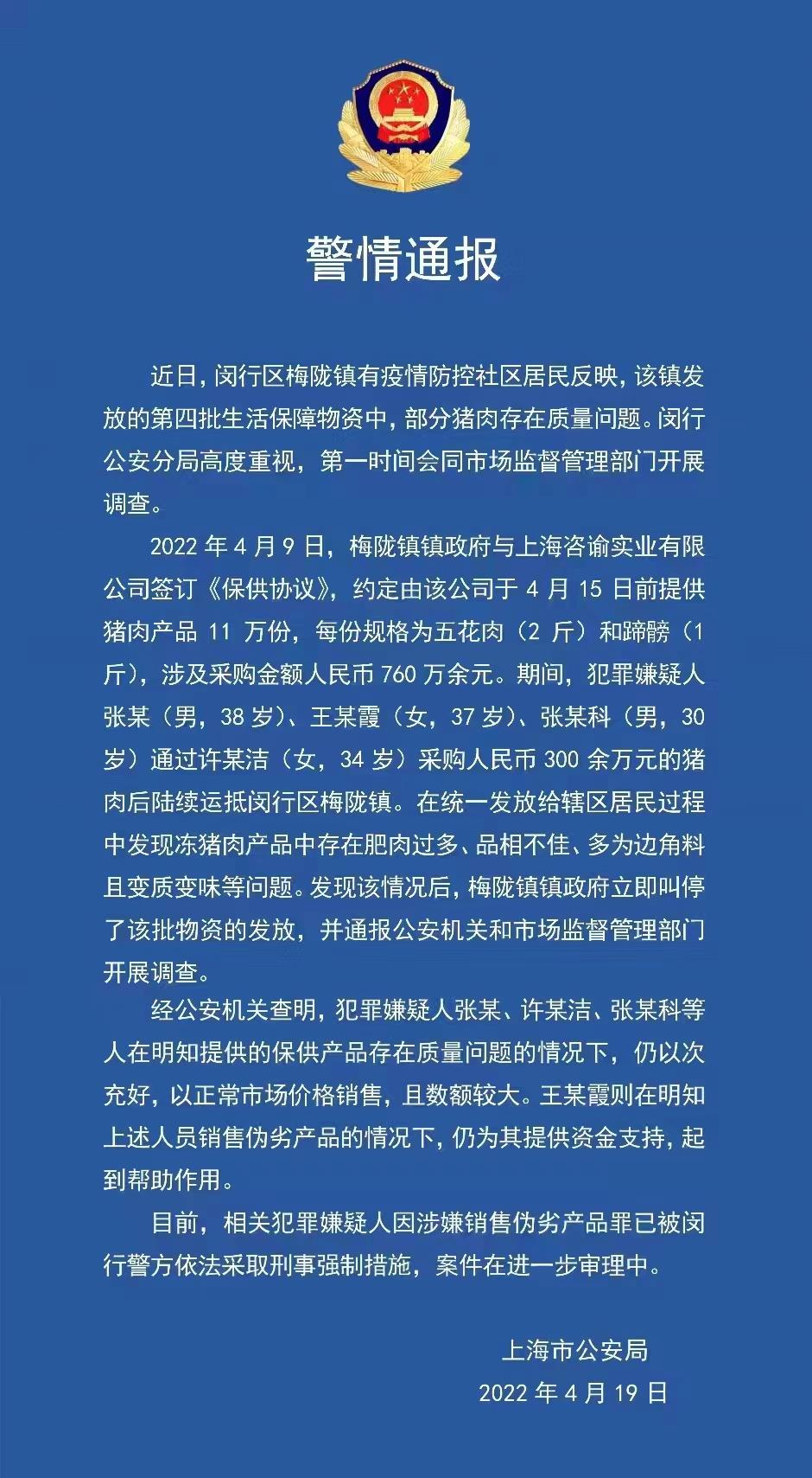 警方通報:2022年4月9日,梅隴鎮鎮政府與上海咨諭實業有限公司簽訂《保供協議》,約定由該公司于4月15日前提供豬肉產品11萬份,每份規格為五花肉(2斤)和蹄髈(1斤),涉及采購金額人民幣760萬余元。其間,犯罪嫌疑人張某(男,38歲)、王某霞(女,37歲)、張某科(男,30歲)通過許某潔(女,34歲)采購人民幣300余萬元的豬肉后陸續運抵閔行區梅隴鎮。在統一發放給轄區居民過程中發現凍豬肉產品中存在肥肉過多、品相不佳、多為邊角料且變質變味等問題。發現該情況后,梅隴鎮鎮政府立即叫停了該批物資的發放,并通報公安機關和市場監督管理部門開展調查。
