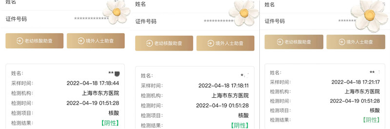 4月18日,在“四葉草”方艙隔離的媽媽已順利返家。4月19日6點多,剛睡醒的我迫不及待的打開核酸檢測查詢,結果很喜人:我們一家三口齊刷刷地“陰”了。接下來,只要再做一次核酸,大家全“陰”,我們就可以回家了。
