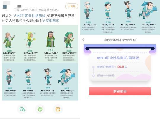 MBTI測試推廣鏈接,需要付費才能解鎖報告。(手機截圖)