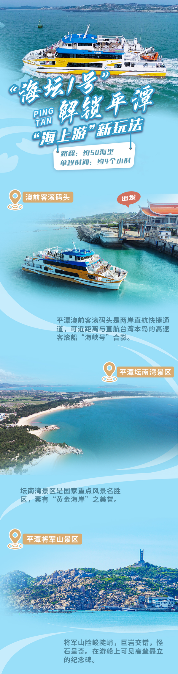據(jù)介紹,“平潭—莆田湄洲島”海上旅游航線將從平潭澳前客滾碼頭出發(fā),游客一路可欣賞姜山島、壇南灣、將軍山、海壇天神等海景風(fēng)光,也可近距離打卡南日群島海上風(fēng)車田以及路嶼燈塔等景觀,經(jīng)過約4個小時的航程,抵達(dá)莆田湄洲島。