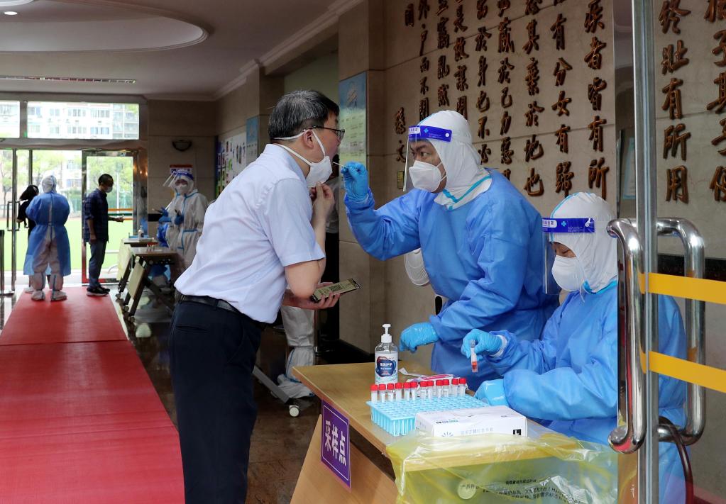 6月5日,上海市大同中學(xué)的教師職工在進(jìn)行每日核酸采樣實操演練。 新華社記者 劉穎 攝