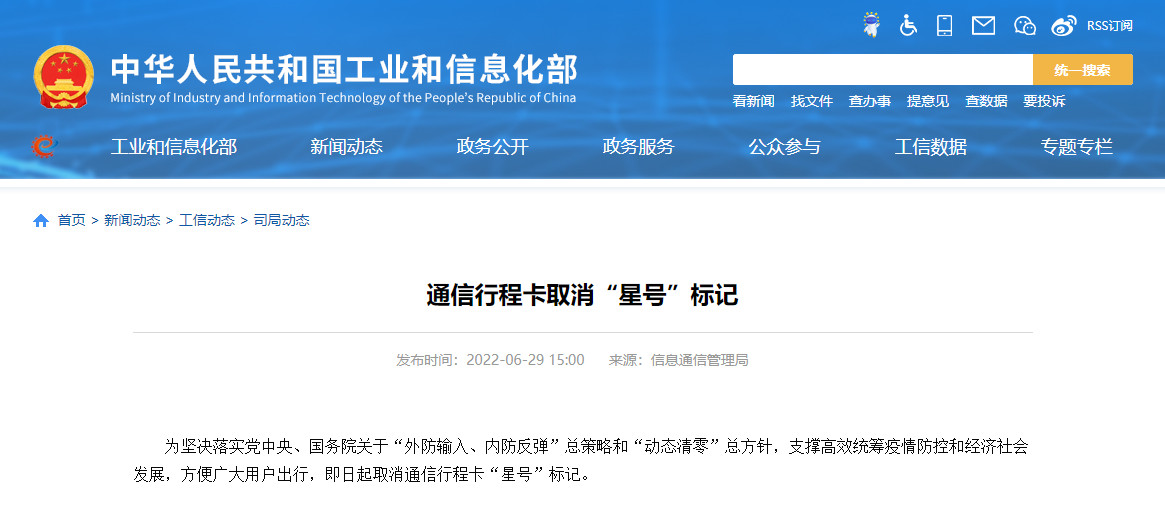 人民網北京6月29日電 (記者申佳平、趙竹青)據工信部網站消息,為堅決落實黨中央、國務院關于“外防輸入、內防反彈”總策略和“動態清零”總方針,支撐高效統籌疫情防控和經濟社會發展,方便廣大用戶出行,即日起取消通信行程卡“星號”標記。
