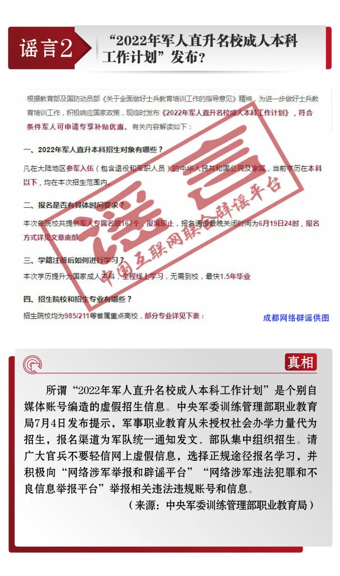 散布招錄虛假信息,實則詐騙取財。當前正值高考招生錄取階段,個別機構和個人發布虛假招生信息,比如“2022年軍人直升名校成人本科工作計劃發布”“高校招生有內部指標,可實現低分高錄”等,以及假冒北京理工大學、中南林業科技大學、青島大學等正規大學發布虛假招生廣告,利用網民在軍事職業教育和高校招生方面的知識盲區,偽造政策內容,虛構招生計劃。此外,諸如名為“河南傳媒大學”等“野雞大學”也趁機冒頭,使用與正規高校相似的校名,仿冒正規高校官網信息,實施偽裝,騙取考生和家長的信任,以達到騙取錢財的目的。
