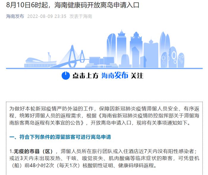 2022年8月10日6:00起,在海南健康碼開放離島申請入口。滯留人員可在海南健康碼首頁點擊“離瓊申請”,分步完成通信行程卡核驗、填報個人信息、當前所在市縣、離島目的地、擬離島日期、擬離島方式、擬離島口岸等信息后,即可提交申請。