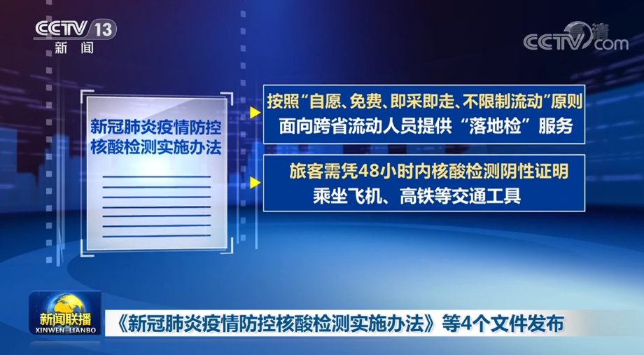 《新冠肺炎疫情防控核酸檢測實施辦法》明確:在常態化監測中,沒有發生疫情的地區,一般不按行政區域開展全員核酸檢測。按照“自愿、免費、即采即走、不限制流動”原則,面向跨省流動人員提供“落地檢”服務,旅客需憑48小時內核酸檢測陰性證明乘坐飛機、高鐵等交通工具。對入住賓館酒店和進入旅游景區人員需查驗健康碼和72小時內核酸檢測陰性證明。