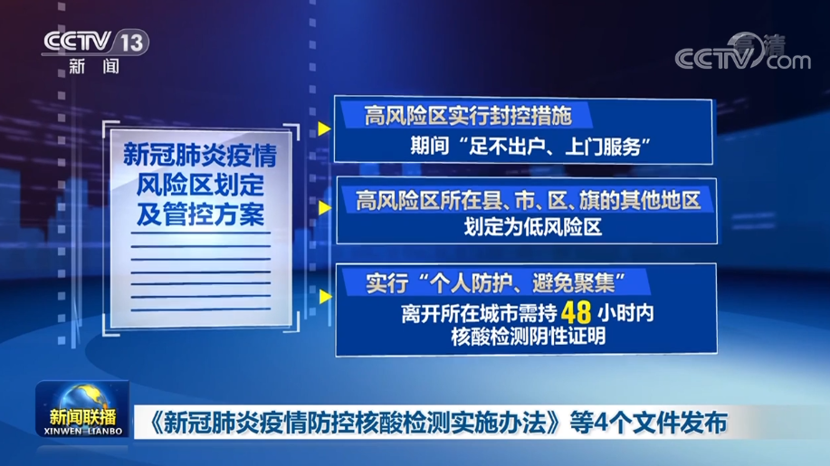 《新冠肺炎疫情風險區劃定及管控方案》明確了風險區劃定標準及相應的防控措施和解除標準。高風險區一般以單元、樓棟為單位劃定。在疫情傳播風險不明確或存在廣泛社區傳播的情況下,可適度擴大高風險區劃定范圍。高風險區實行封控措施,期間“足不出戶、上門服務”。高風險區所在縣、市、區、旗的其他地區劃定為低風險區。實行“個人防護、避免聚集”,離開所在城市需持48小時內核酸檢測陰性證明。