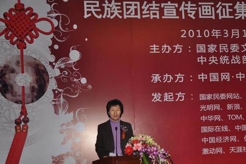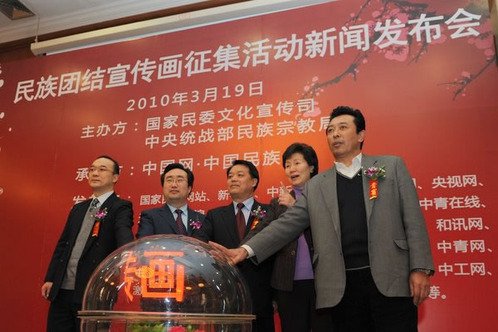 為貫徹落實(shí)中共中央辦公廳、國務(wù)院辦公廳《關(guān)于深入開展民族團(tuán)結(jié)宣傳教育活動(dòng)的意見》精神,向社會(huì)提供主題鮮明、健康向上、反映時(shí)代風(fēng)貌、準(zhǔn)確權(quán)威的民族團(tuán)結(jié)宣傳品,展示我國各民族共同團(tuán)結(jié)奮斗、共同繁榮發(fā)展的時(shí)代風(fēng)貌,由國家民委文化宣傳司、中央統(tǒng)戰(zhàn)部民族宗教局主辦,中宣部宣教局支持,中國網(wǎng)中國民族頻道承辦,國家民委網(wǎng)站、中國民族宗教網(wǎng)、人民網(wǎng)、中新網(wǎng)、中國網(wǎng),光明網(wǎng)、中國文明網(wǎng)、中華網(wǎng)、TOM、中國經(jīng)濟(jì)網(wǎng)、國際在線、中青在線、中青網(wǎng),央視網(wǎng)、中國廣播網(wǎng)、鳳凰網(wǎng)、中國經(jīng)濟(jì)新聞網(wǎng)、網(wǎng)易、新浪網(wǎng)、騰訊、搜狐、千龍網(wǎng)、優(yōu)酷網(wǎng)、酷六網(wǎng)、貓撲網(wǎng),激動(dòng)網(wǎng)、中工網(wǎng)、天涯社區(qū)、環(huán)球網(wǎng)、中國日報(bào)網(wǎng)、和訊網(wǎng),中國企業(yè)新聞網(wǎng),北青網(wǎng)等共同發(fā)起宣傳的民族團(tuán)結(jié)宣傳畫征集活動(dòng)新聞發(fā)布會(huì)于2010年3月19日下午在北京國家民族事務(wù)委員會(huì)舉行,國家民委副主任丹珠昂奔及國家民委、中央宣傳部、中央統(tǒng)戰(zhàn)部有關(guān)部門的同志出席了新聞發(fā)布會(huì)。