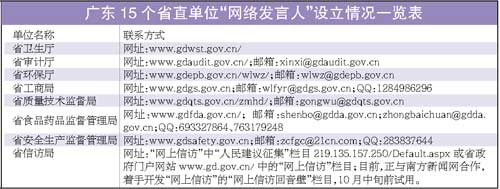省委辦公廳第二次網(wǎng)友集中反映問(wèn)題交辦會(huì)要求首批設(shè)立“網(wǎng)絡(luò)發(fā)言人”的l5個(gè)省直單位,至昨天已全部設(shè)立“網(wǎng)絡(luò)發(fā)言人”,并開(kāi)始履行職責(zé)。這標(biāo)志著廣東在建立網(wǎng)絡(luò)發(fā)言人制度上邁出實(shí)質(zhì)性步伐。