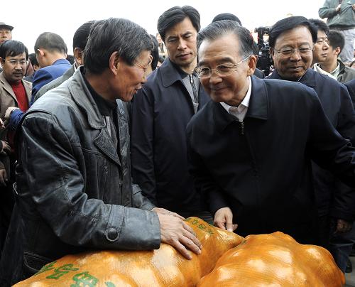 10月17日至18日,中共中央政治局常委、國務(wù)院總理溫家寶來到甘肅定西、蘭州等地,走訪農(nóng)戶,考察市場、企業(yè)、研究所,就扶貧開發(fā)、生態(tài)建設(shè)、改善民生情況進(jìn)行調(diào)查研究。這是10月17日,溫家寶在定西馬鈴薯綜合交易中心考察。新華社記者 李學(xué)仁攝