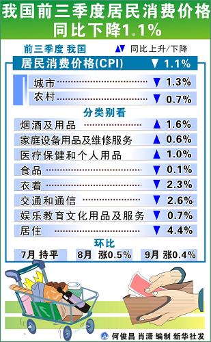 統計顯示,從同比情況看,前三季度我國CPI下降1.1%。從更能反映價格變動的環比情況看,CPI7月份由下降轉為持平,8、9月份分別上漲0.5%和0.4%。