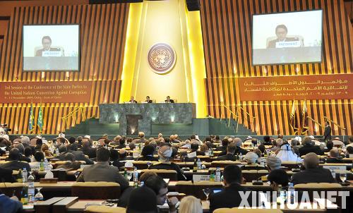 《聯(lián)合國反腐敗公約》第三次締約國會議在卡塔爾開幕。11月9日,與會者在卡塔爾首都多哈參加《聯(lián)合國反腐敗公約》第三次締約國會議。為期5天的《聯(lián)合國反腐敗公約》第三次締約國會議9日在卡塔爾首都多哈開幕,來自公約締約國、簽署國及多個聯(lián)合國專門機構(gòu)和非政府組織的代表約1000人出席會議。 本屆會議將就建立一個審議各國履行《聯(lián)合國反腐敗公約》情況的機制進行討論。同時,與會代表還將就如何追回被腐敗分子帶到境外的資產(chǎn)等問題進行探討。新華社記者杜健攝