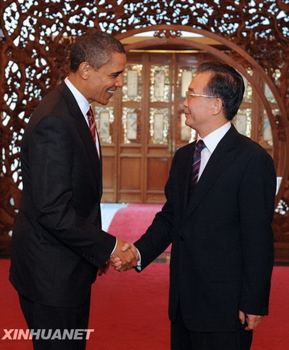 11月18日,中國國務院總理溫家寶在北京釣魚臺國賓館會見正在中國進行國事訪問的美國總統奧巴馬。