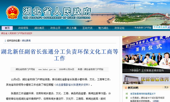 人民網北京12月8日電 據湖北省政府網站消息,新任湖北省副省長張通分管環(huán)保、文化、工商等工作,其他省政府領導分管的工作也做了相應調整。