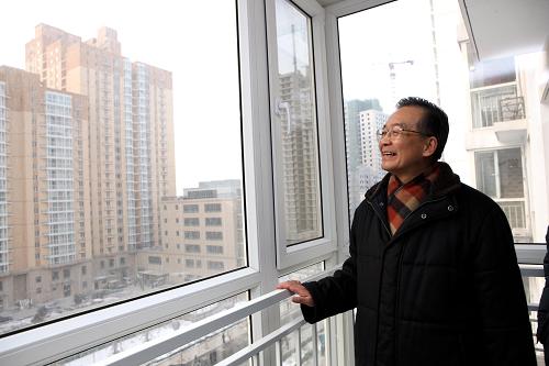 這是在北京市朝陽區(qū)的保障性住房項目弘善家園,溫家寶走進(jìn)尚未入住的房間仔細(xì)察看。 新華社記者姚大偉攝
