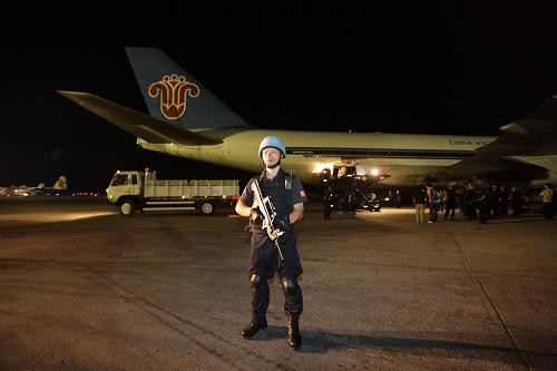 1月17日,在海地太子港,中國駐海地維和警察李樹宏在機場警戒。當地時間當日凌晨4點11分,中國政府援助海地地震災區的物資抵達太子港。這批物資重約90噸,價值人民幣1300余萬元,包括20余萬份藥品、1000頂帳篷、240套便攜式應急燈、2套水凈化設備、1250公斤食品和飲用水、4080件單衣等。新華社記者 邢廣利 攝