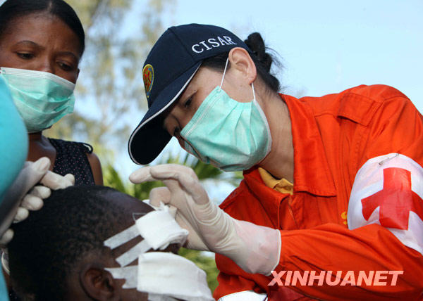 1月17日,一名中國國際救援隊醫療隊員在海地太子港為地震受傷人員換藥。當日,中國國際救援隊隊員繼續在太子港進行醫療服務,他們深入災民集中居住區為受傷人員診治換藥和進行衛生防疫工作。新華社記者 袁滿 攝