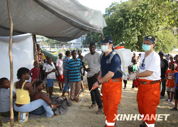 1月17日,中國國際救援隊醫療隊員在海地太子港臨時居住區內噴灑消毒劑。新華社記者 袁滿 攝