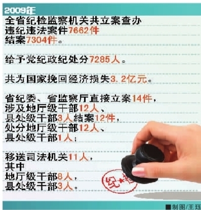 2009年,全省紀檢監察機關共受理群眾來信、電話、網絡舉報41468件,立案7662件,結案7304件,給予黨紀政紀處分7285人,其中,地廳級干部12人,縣處級干部195人,移送司法機關357人。為國家挽回直接經濟損失3.2億元。省紀委、省監察廳直接立案14件,涉及地廳級干部12人、縣處級干部3人,結案12件,處分地廳級干部12人、縣處級干部1人;移送司法機關11人,其中地廳級干部8人,縣處級干部3人。