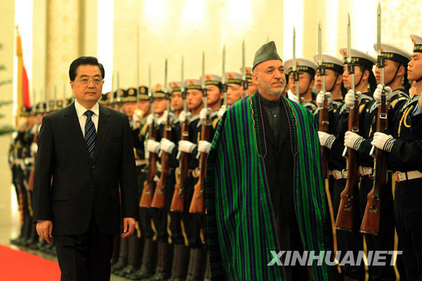 3月24日,中國國家主席胡錦濤在北京人民大會堂舉行儀式,歡迎阿富汗總統卡爾扎伊訪華。新華社記者樊如鈞攝