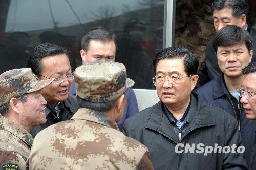 4月18日,中共中央總書記、國家主席、中央軍委主席胡錦濤飛抵玉樹,看望慰問地震災區(qū)干部群眾,實地指導抗震救災工作。 中新社發(fā) 盛佳鵬 攝
