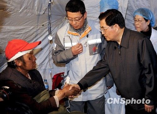 4月18日中午12點10分許,中共中央總書記、國家主席、中央軍委主席胡錦濤先來到青海玉樹地震重災區結古鎮扎西大同村視察災情,慰問災區受災民眾以及參加抗震救援的解放軍指戰員、武警、公安等。