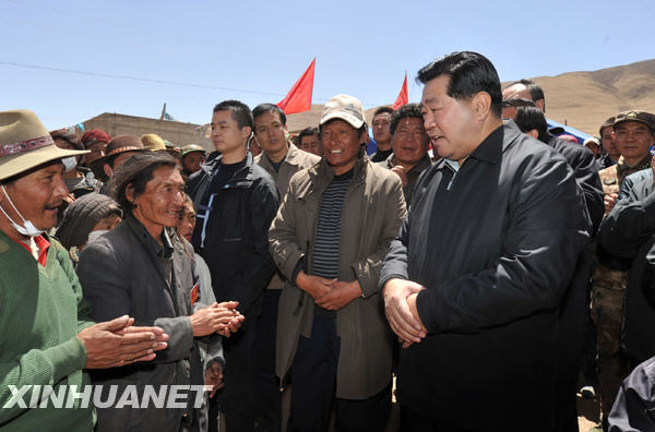 這是賈慶林在玉樹縣上拉秀鄉加吉娘社區看望受災群眾。新華社記者黃敬文攝