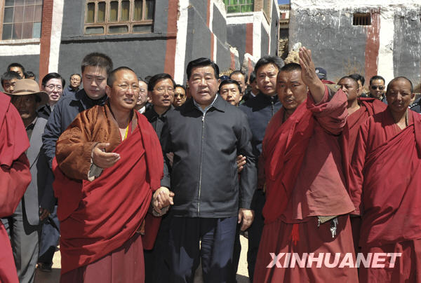 這是賈慶林在玉樹縣結古寺看望慰問宗教界人士。新華社記者黃敬文攝