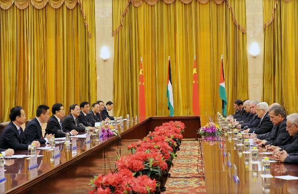 5月1日,中國國家主席胡錦濤在上海與來華進行國事訪問并出席上海世博會開幕式的巴勒斯坦國總統、民族權力機構主席阿巴斯舉行會談。新華社記者饒愛民攝