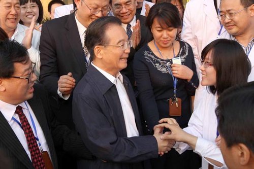 5月13日至14日,中共中央政治局常委、國務(wù)院總理溫家寶在天津調(diào)研。這是5月13日,溫家寶在天津市國際生物醫(yī)藥聯(lián)合研究院考察時與員工親切交談。 新華社記者 劉衛(wèi)兵 攝