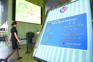 20日,中海油總部大堂豎起“每日能耗統計牌”,明示前一天大廈用電、用水量等信息,墻上的大屏幕則不間斷播放綠色辦公宣傳短片,這些舉措時刻提醒每一位員工節能環保。(記者童曙泉/席賀興攝 )